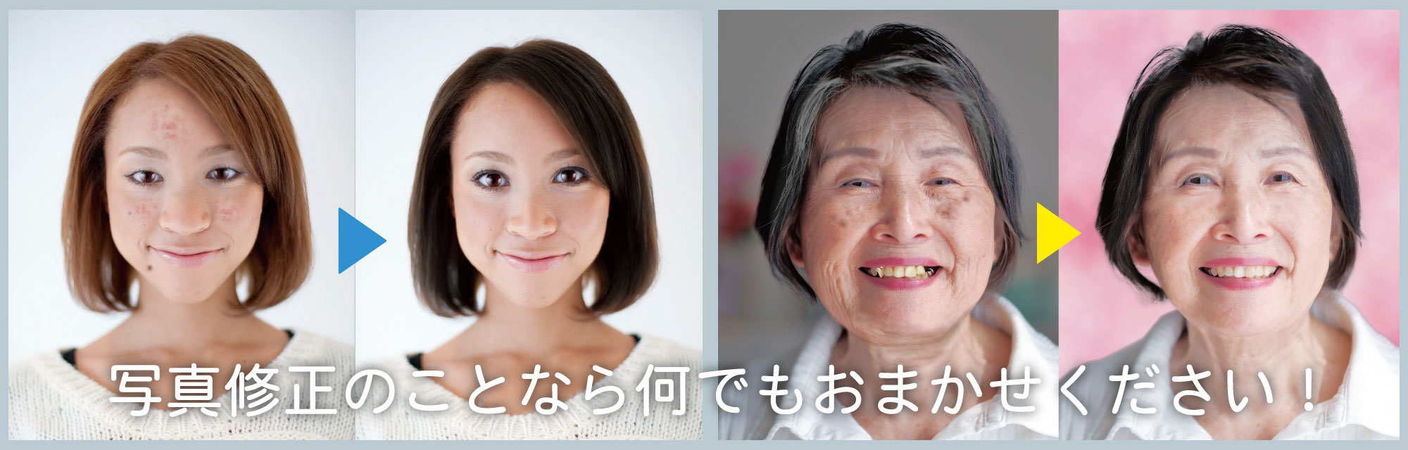 目を大きく修正 二重まぶた加工 視線の補正(視線の向きや斜視の補正) 鼻の修正 歯・歯茎の修正 フェイスライン+二重あごの修正 二重あご+首のシワの修正 化粧効果による美化修正 美肌加工 ヘアカラー変更 表情修正 顔面各部修正 スタイル修正 グラビア的写真修正 年配者向け修正